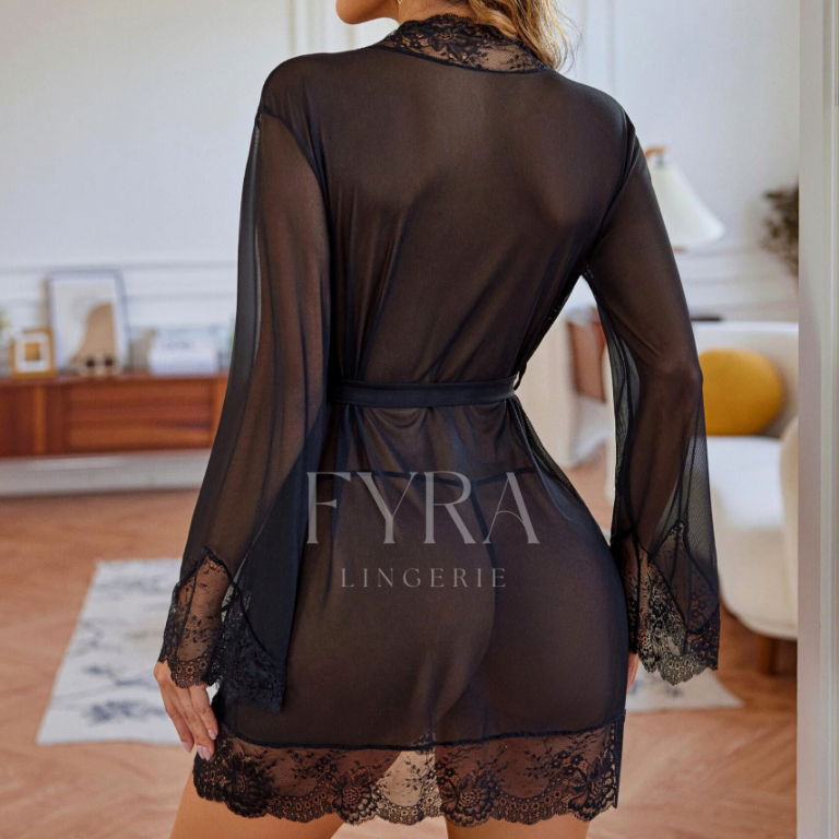 Robe/kimono de lingerie em tule transparente preto, com acabamentos em renda floral nas mangas e na barra. Tecido leve e fluido que cai de forma delicada e sobre a pele. Com mangas longas e levemente amplas estilo francês.