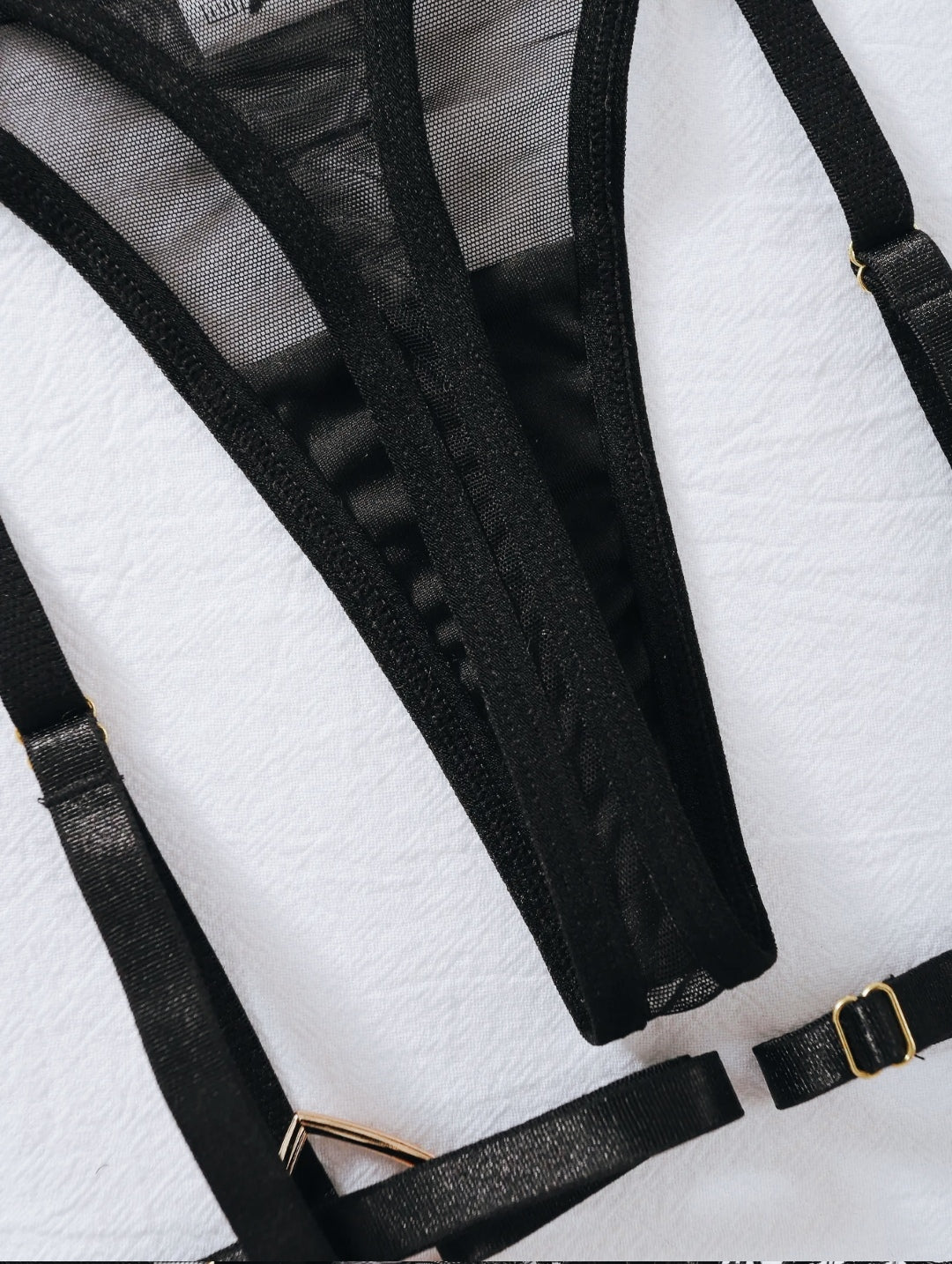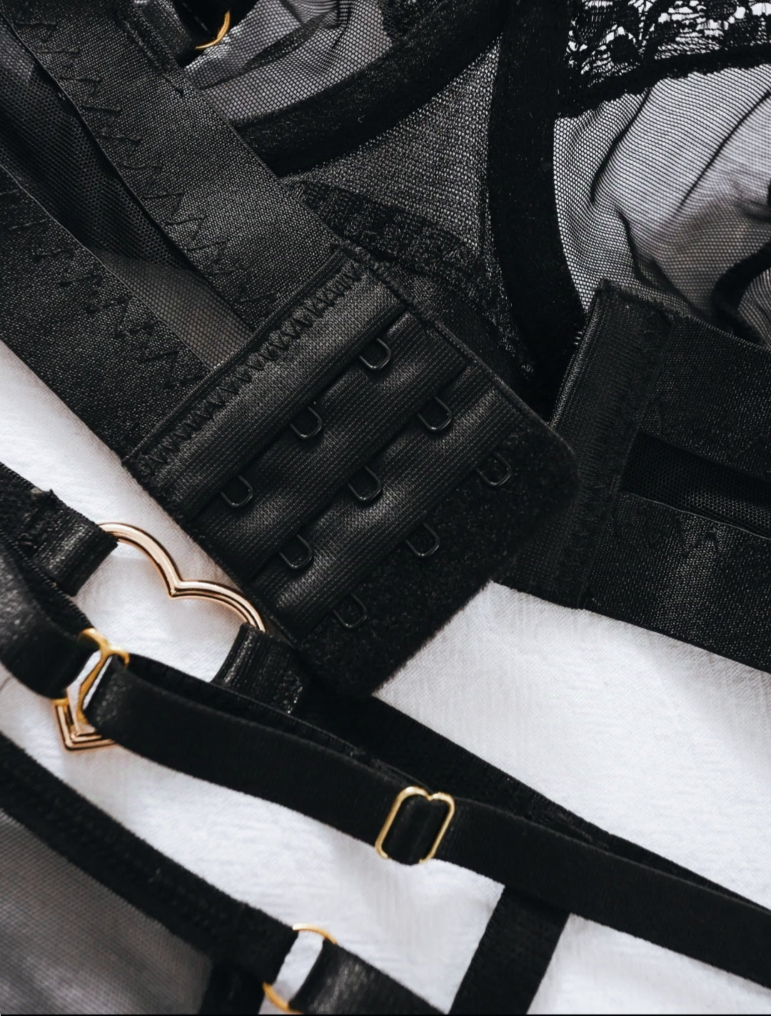 Set de lingerie Olivia, sedução e elegância em cada detalhe. Composto por cinco peças deslumbrantes – soutien, cueca, choker/gargantilha, cinto de ligas e jogo de ligas para as pernas. Este conjunto foi desenhado para valorizar cada curva do corpo feminino!