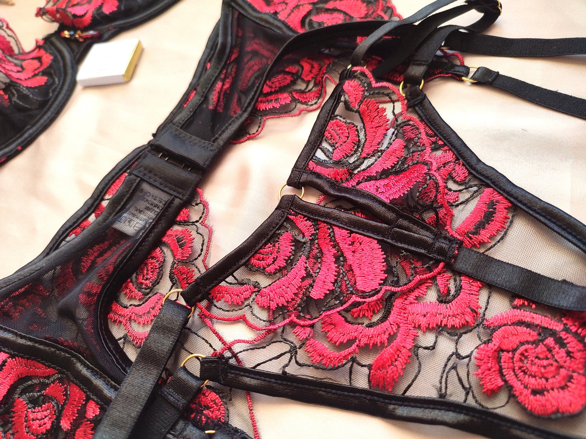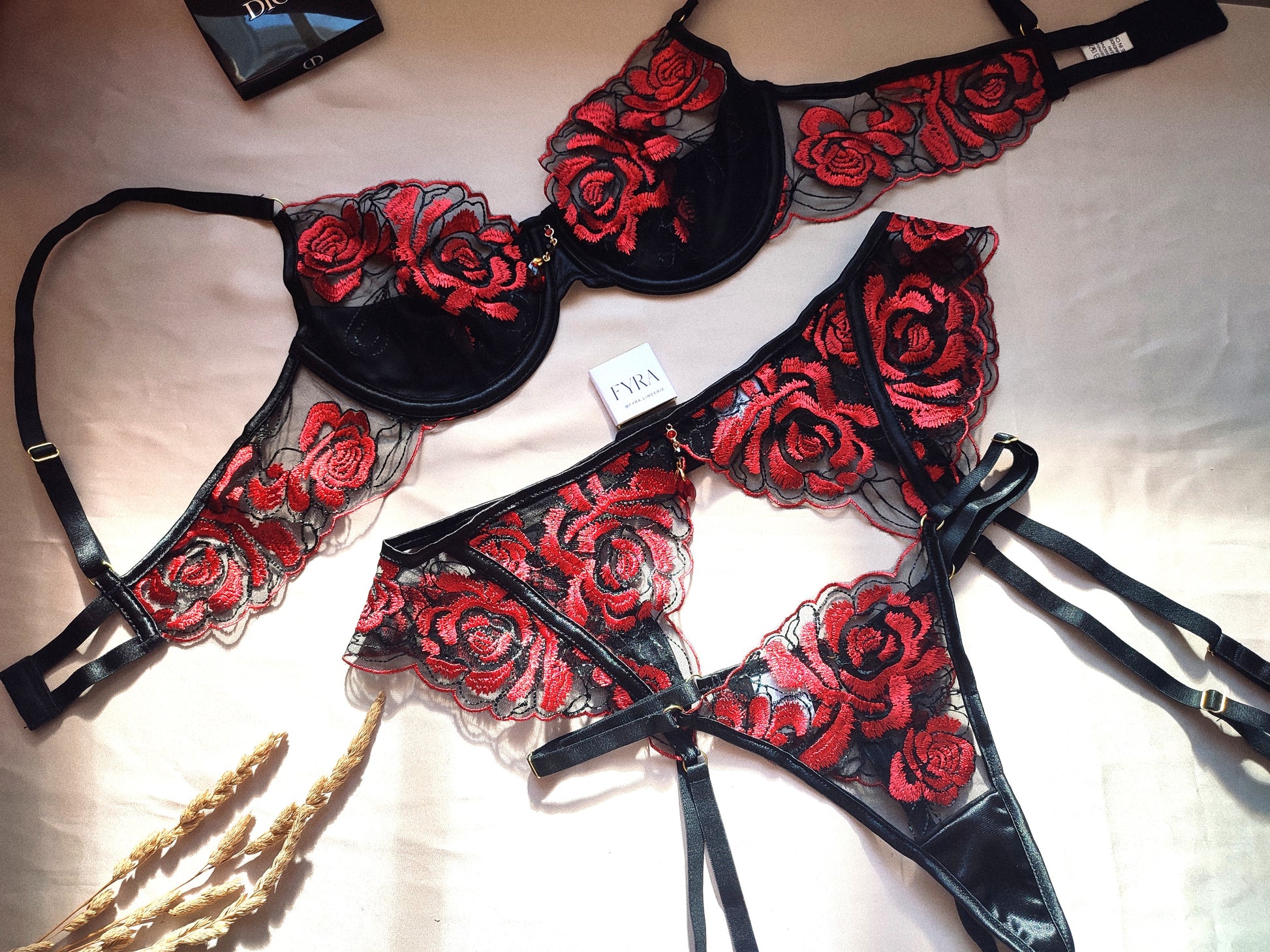 Rose, conjunto de lingerie preto rendado com padrão vermelho floral bordado, pequenos detalhes dourados e pedras/pingentes vermelhos. O set Rose é composto por soutien, cueca/tanga e ligueiro. O soutien e tanga possuem alças reguláveis para um ajuste perfeito ao corpo. O tecido levemente elástico confere liberdade de movimentos e a estrutura da parte superior com aro confere um leve suporte aos seios - metade da copa do soutien em tecido preto acetinado suave.