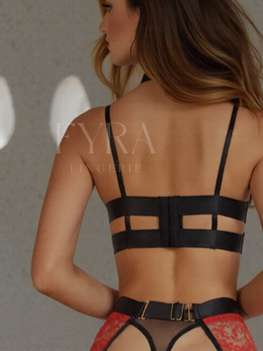 Zahara Red, set de lingerie em preto e vermelho com renda macia e pequenos detalhes dourados com um toque super feminino e sofisticado! O tecido elástico confere liberdade de movimentos e a estrutura da parte superior com aro confere um leve suporte aos seios.